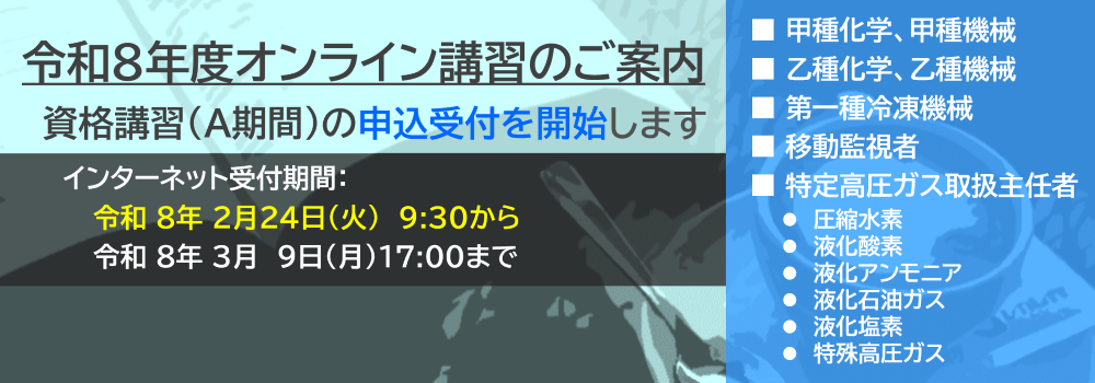 【今年度最後の受付です】◆令和7年度E期間 法定資格講習・義務講習の追加受付を開始しました(11月26日~12月2日)◆【液化石油ガス設備士第2・3、移動監視者、乙種化学、乙種機械、丙種化学(液石)、丙種化学(特別)、第二種冷凍機械、第三種冷凍機械、第二種販売、業務主任者の代理者、保安企画推進員、保安主任者、保安係員(一般・LP)、業務主任者、液化石油ガス設備士再、充てん作業者再】