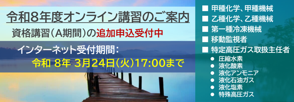 ◆令和8年度A期間 法定資格講習の追加受付について◆右記の法定資格講習について、追加受付を開始しました。(甲種化学、甲種機械、乙種化学、乙種機械、第一種冷凍、特定高圧ガス取扱主任者(圧縮水素、液化酸素、液化アンモニア、液化石油ガス、液化塩素、特殊高圧ガス)、移動監視者))【受付期間:3月18日(水)~3月24日(火)まで】