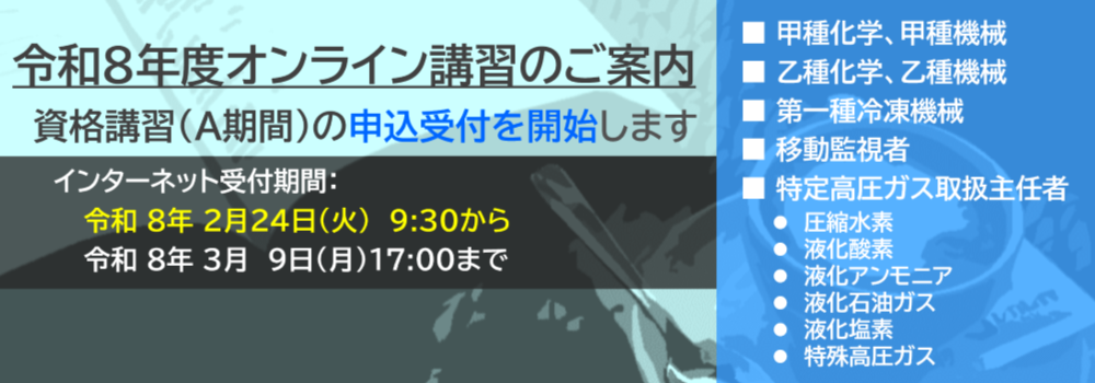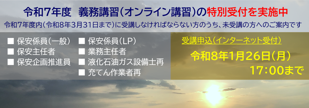 【今年度最後の受付です】◆令和7年度E期間 法定資格講習・義務講習の追加受付を開始しました(11月26日~12月2日)◆【液化石油ガス設備士第2・3、移動監視者、乙種化学、乙種機械、丙種化学(液石)、丙種化学(特別)、第二種冷凍機械、第三種冷凍機械、第二種販売、業務主任者の代理者、保安企画推進員、保安主任者、保安係員(一般・LP)、業務主任者、液化石油ガス設備士再、充てん作業者再】